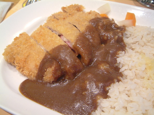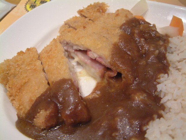 再淋上咖哩,入口的咖哩豬排除了咖哩的香味外,還有濃濃的起司味,